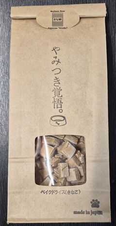 国産米粉のみを使用し、つなぎは一切使わない”ベイクドライス”のきなこ味です。 兵庫県の丹波篠山で作られた黒豆きな粉のみを使用しております。 味わいのイメージは砂糖等不使用の”安倍川(あべかわ)もち”です。 至ってシンプルなトリーツですが、きな粉は栄養バランスに優れた食材と言われており、 黒豆きな粉に関してはポリフェノールも豊富です。 良質な食物性たんぱく質を手軽にこのトリーツで。 |