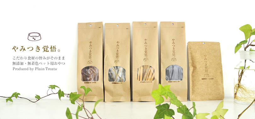 | 『やみつき覚悟』はPlain Treatsがプロデュースする素材の旨みをそのまま生かした ペット用おやつです。 やみつき覚悟。はとにかく食材をシンプルに調理したおやつ作りをしています。 その分素材には徹底的にこだわり、旨みがしっかり詰まったものだけを使用しています。 だから余計なものを加えなくても「やみつき」になってしまう美味しさ。 そしてシンプルだから作るのも簡単、ということでは決してありません。 私たちの食生活を見ても分かるように、簡単に調理できるものほど、 保存料や添加物などを使わなければなりません。 素材を大事にしながら調理するためには、じっくり丁寧な作業が必要。 ペットは私たちの大切な家族の一員ですから、身体も喜ぶ おやつ作りをし続けていきたいと思っています。 |